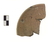 | Description: | Four joining fragments make up about one-quarter of saucer. Flat base with string marks. Straight wall. Pink-orange wash inside. Pale buff fabric with gray core. | |