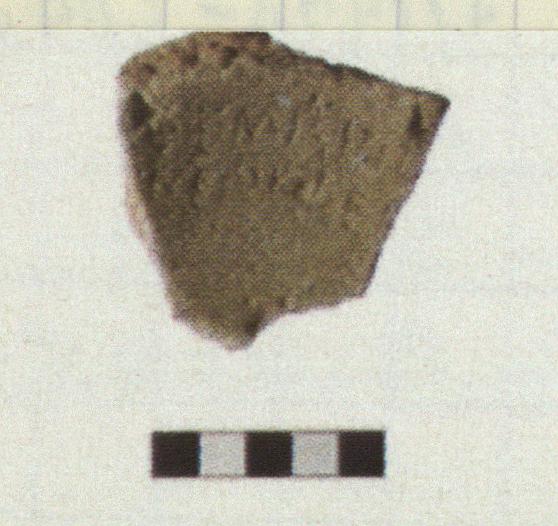 Description:   Single fragment from the base of a mortar. Flat base; interior sloping down toward center.
