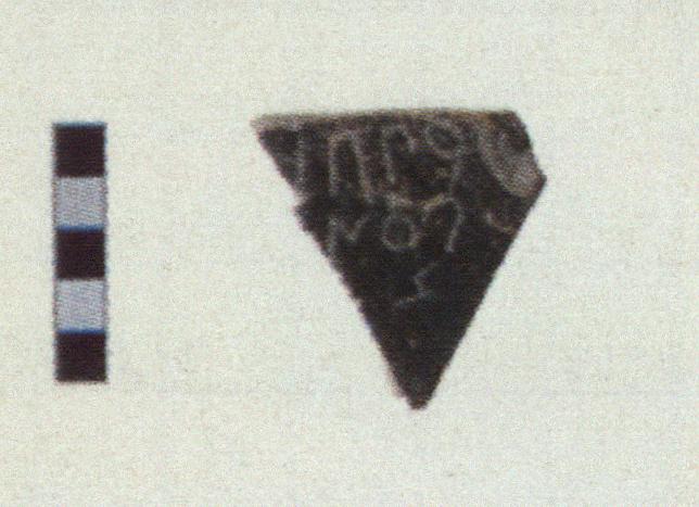 | Description: | Single wall fragment, triangular in shape, broken all around. Glaze worn. Inscribed letters, left to right, on exterior, preserving end of name and patronymic of Xanthippos: <graphic> Pink-buff clay, black slip on exterior. | |
