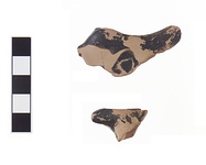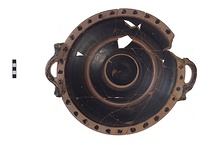 | Description: | Mended from many fragments. Nearly complete except for small sections of wall and piece of rim. Two loose rim fragments. Ring foot with groove on outer face. Out-turned flat rim, two horizontal ribbon handles rising just above rim. Interior glazed except for two reserved bands; rim also reserved, with a series of sloppy dots. Exterior unglazed, with a wide band at rim, one at junction with foot and one midway. Outer face of handles glazed. Dimple in center inside. Matte black glaze, soft orange fabric. | |