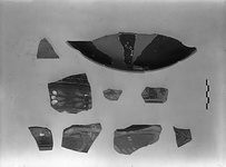 | Description: | Straight wall, square lip; around the side wall near the top runs a band of conventional flowers separated by vertical lines; the leaves are done in thin clay, the lines probably in white paint. The glaze has been scratched from a line beneath the lip. | |