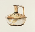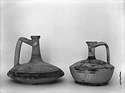 Description:   Parts are missing from the mouth and side wall. Low body, side wall meeting shoulder in an obtuse angle. Neck of medium height, flaring mouth. Strap handle doubly grooved. Band of black paint encircles the base ring and the lower part of the side wall. Around top of side wall is another broad band, with two lines below, and two lines on the shoulder above. Black band around root of neck and another around lip. On top of shoulder, four ribbons with tasselled ends tied in bow-knots to the root of the neck. In field, short black strokes. Traces of paint on back of handle and around point of attachment to neck.