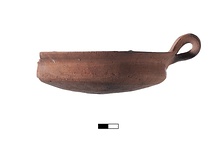 Description:   Missing half of body and slightly over half of rim. Rounded body with marks of wheel-trimming. Slightly inclined upper wall. Projecting rim with flange for lid on interior. Loop handle attached to rim.