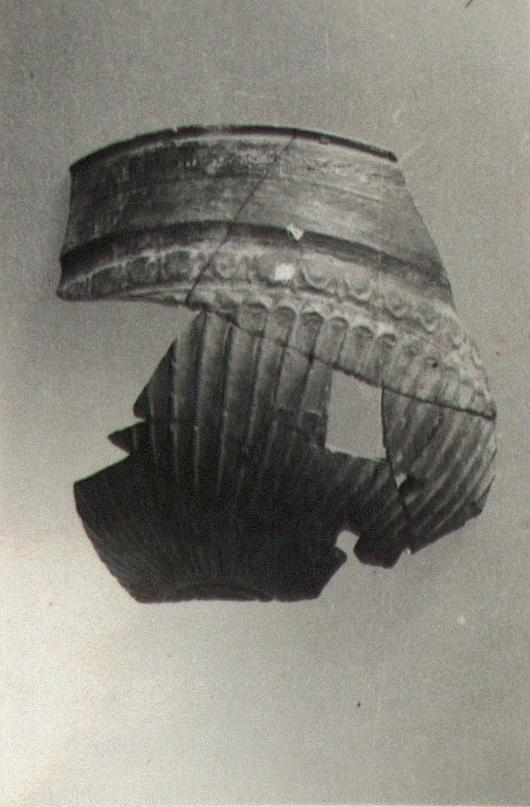 | Description: | About one-third of the bowl remains. On the medallion a rosette; from it spring elongated petals; the upper zone is a band of egg and dart. Fine buff clay, thin metallic glaze, fired to red in the lower part. | |