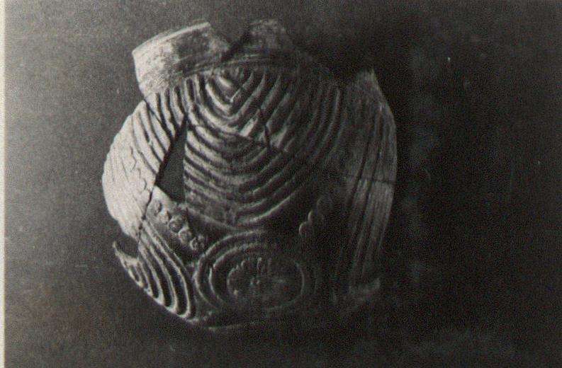 | Description: | Much of rim and side wall missing. In the medallion, a rosette with alternating petals and sepals. The side wall is occupied by four groups of concentric semicircles suspended from a raised line which constitutes the upper zone; between each group there is a jewelled line, forked at the top. Fine buff clay, thin black glaze somewhat flaked. | |