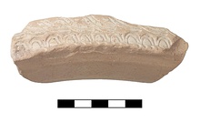 | Description: | Single rim fragment. Strongly out-turned upper wall. Overhanging rim with stamped design: rope pattern on top. Ovolo and parallel scallops below. Soft light red fabric (2.5 YR 6/6). Pink slip (5YR 7/4) outside, mostly missing except on patterned rim. Many fine sparkling inclusions; some pieces of micaceous pink rock. Hellenistic. | |
