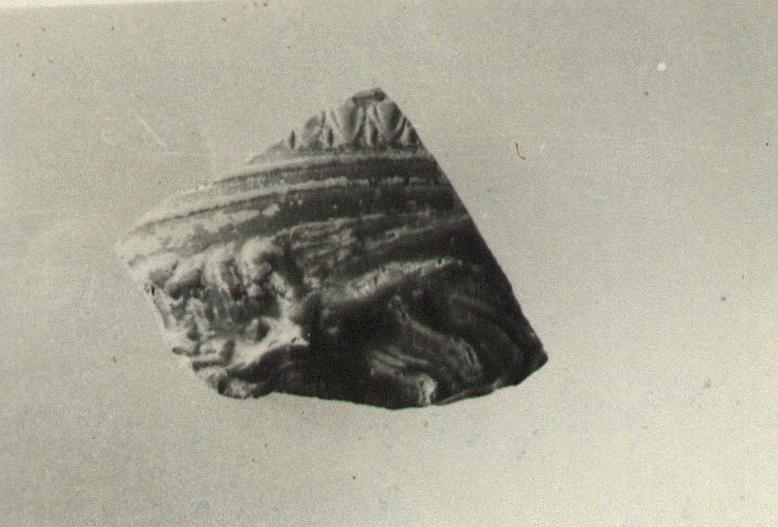 | Description: | Only a fragment of side wall and upper zone remains. On the side wall are the horses of a quadriga galloping left; on the upper zone remains a band of egg and dart; the relief is high. Dull black glaze, somewhat flaked. | |