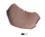 | Description: | Single piece preserving half of one side of lower part. Rounded interior, slightly angled exterior profile; low ledge-like foot. Part of a single cross stamp, L.R.P. motif 73, debased, at center. Red clay and slip; interior smooth. Phocean red slip ware Vessel type uncertain. (Hayes L.R.P. form 3? - small sized, perhaps late.) | |