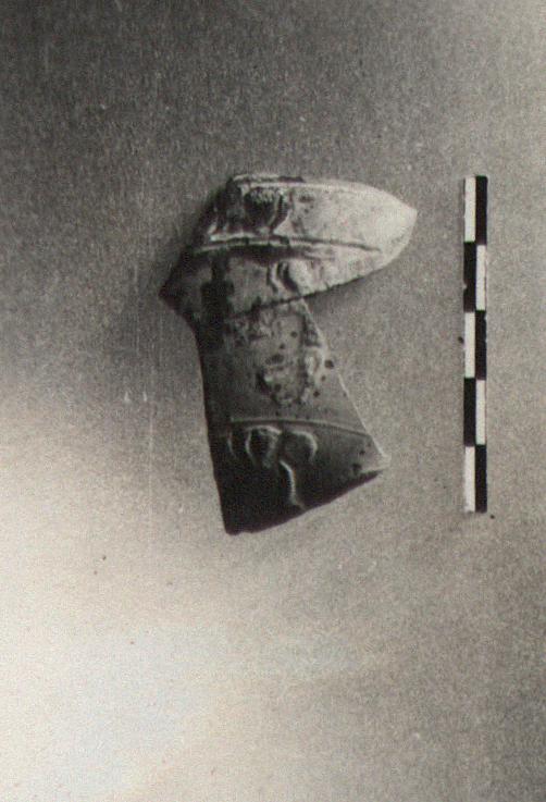 | Description: | Only a fragment of the side wall and upper zone remains. The lower side wall is divided by a fine raised line into two zones; in the lower a winged victory stands, a wreath in her left hand, the right arm raised above her head; in the upper a victory flies right; above, a band of ovules. Buff clay, covered with black glaze much flaked. | |