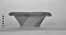 | Description: | Much of side wall and bottom missing. Restored in plaster. Low, false base ring; almost straight walls; down-curved rim; loop handles pinched against the rim at their mid-point. Gritty clay, fired to buff and green; unglazed. The inside is covered with a very thin wash of red glaze. | |
