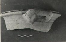 | Description: | Fragment from the rim, and one handle. The lip curves gently out and is sharply indented at its outer edge; heavy loop handle. Coarse yellow clay covered on the inside with a thin red wash. Unglazed. | |