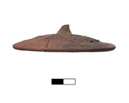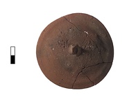 Description:   Complete except for tip of knob. Mended from four fragments. Slightly convex on top, with pyramidal handmade knob. Rounded lip. Irregular shape.