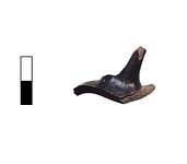 Description:   Small fragment from wall of black-glazed cup with part of rim and stump of handle preserved. Out-turned rim with narrow reserved band on interior of rim just below lip.