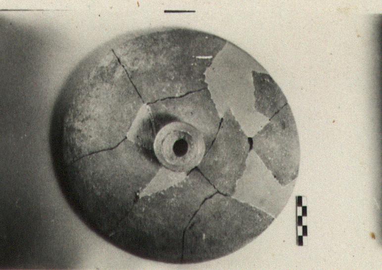 | Description: | Small fragments missing. Restored in plaster. Convex lid, fitted with a large knob, hollow on top. Coarse red clay, unglazed. | |