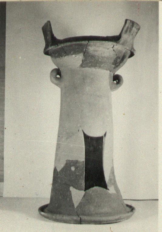 | Description: | Much of fire bowl and base remain but they do not join. Restored in plaster. The fire bowl is deep, the bottom pierced by one central and three lateral holes; broad, down-curving rim set slightly below the lip. From the rim rise three rectangular lugs, inner faces decorated with satyr masks in relief; the out-thrust beards supported the cooking vessel. The stand consists of a hollow column swelling toward the bottom and surrounded at the base by a broad channel. One of the handles remains, an upturned loop set on the column close below the fire bowl. The column is pierced on one side toward the bottom by a large air hole. Red clay, containing much grit. Unglazed, blackened by fire on inside of bowl. | |