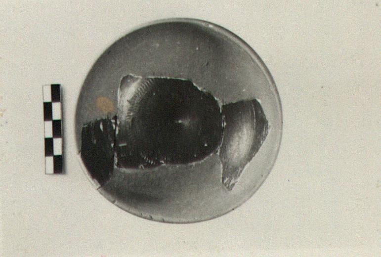 | Description: | Much of side wall missing; restored in plaster. Low base ring; side wall rising in an unbroken curve to a plain lip; the floor is drawn to a low cone both above and below; around the floor a double circle of rouletting. Granular buff clay, covered inside and out with firm red glaze. | |