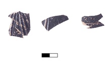 | Description: | Seven fragments, in three sections. Section A preserves part of lower wall, B is part of upper wall, fragment C preserves rim pattern. Floral bowl with tall lotus petals alternating with floral tendrils. Rim: running spiral; ridge; scraped groove; crosshatching. Interior reserved and painted with miltos. Shiny black glaze on outside. | |