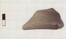 | Description: | Fragment preserving portion of stem and base. Stem has at least one ring. Wheelmade. Lighter gray fabric, fired close to very pale brown 10 YR 8/3-7/3. | |