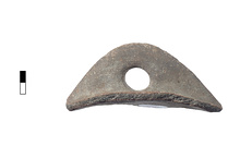 | Description: | Single fragment preserving complete handle and portion of wall. Large horizontal pierced lug handle from large storage vessel; handmade. Dark red clay with dark gray core and traces of off-white slip. Clay: 2.5 YR 5/6. Core: 7.5 YR 4/0. Slip: 7.5 YR 8/2-8/4. Possible discoloration due to burning. | |