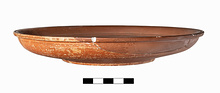 Description:   About half the floor and one-fifth of the rim are preserved. Low ring foot. The floor sweeps into a slightly flaring rim which flattens into a horizontal lip with a shallow groove on top. A moulding, flat against the floor, where the floor turns upward to the rim. Rouletted circle on the floor (over the foot).