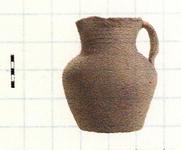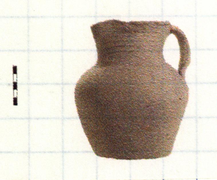 | Description: | About one-third of rim missing, otherwise complete. Two small neck fragments mended and plaster fill. Wide neck with everted lip slightly concave on top, trefoil mouth. Plum body. Flat base untrimmed. Wheel ridges on entire neck, lopsided ridged handle. Gray clay with numerous lime inclusions. Early 5th c. A.D. | |