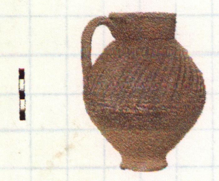 Out-turned lip. Rounded belly. Mid part body wheel-ridged, upper part with oblique gouging, vertical against one side of handle. Sliced handle with four grooves.