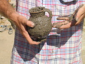 Orange clay, partial dull red brown slip, fired dark brown where thick.