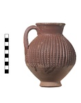 | Description: | Intact except for small chip at rim and foot. Globular body. Oblique gouging on upper two-thirds of body, mid part wheel-ridged overlapping. Dark orange clay, brown-orange glaze (partial) with drips on lower body. Early 5th c. A.D or later 4th c. A.D. | |