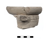 | Description: | Three mended fragments preserving nearly one-third of rim with bit of neck and upper handle segment. Flaring mouth, up-sloping flat top of rounded-exterior, wedge-like rim. Smooth, rounded concave transition from rim to neck; deep groove encircles neck at level of handle attachment. Very narrow oval section handle angles up slightly but does not follow line of rim, also does not push in on neck at all. Daintiness of handle suggests fractional amphora. Pale, tan clay with some mica; sparse to moderate scatter of large white stony and gray glassy bits: very rare small red-orange bits. | |