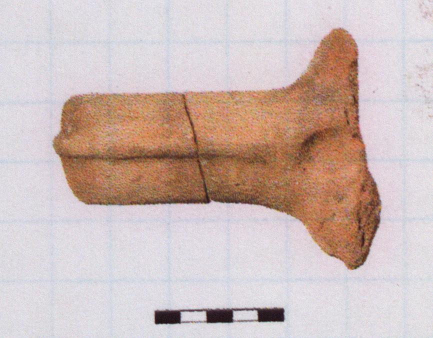 | Description: | Two joining fragments making up most of one handle with attachment to shoulder. Thick, oval section handle with central rib along outer face. Thumbprint at base. Fairly smooth, dark greenish brown surface. Much mica; very dark brown core. | |