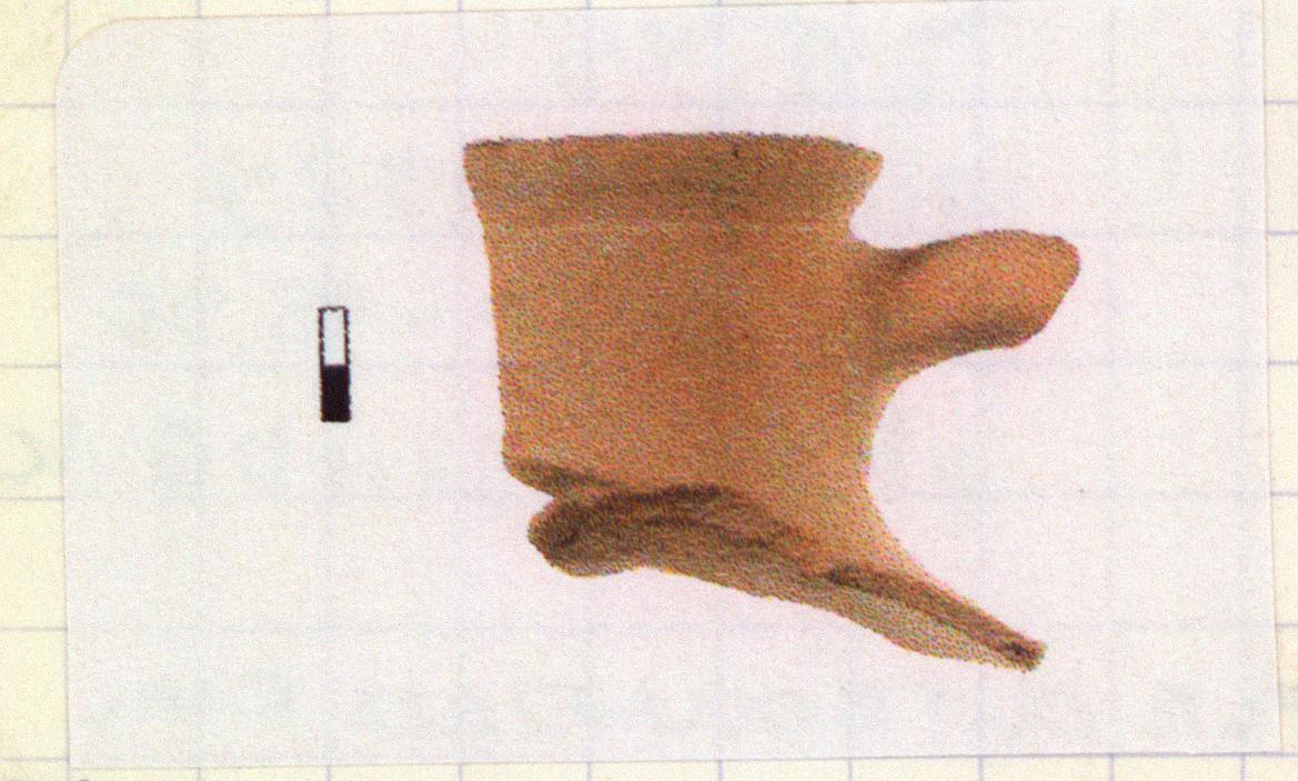 | Description: | About one-third of rim with complete neck profile and one upper handle segment. Squared interior profile wedge rim with flat, slightly downsloping top surface sharply inset from neck wall. Wide, squat cylindrical neck. Oval-sectioned handle placed high on neck. Lumpy, pale pinkish gray surface with light surface preserved in places. Greenish resin on interior. | |