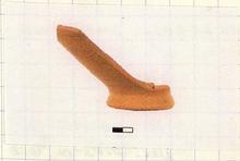 | Description: | Complete toe and one section of lower body. Wide body tapers to flaring-side, ring toe. Underside hollow with projecting nub. Pre-firing strokes across lower surface of toe. Resinated interior. Finely gritty micaceous orange-brown surface. | |