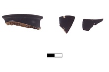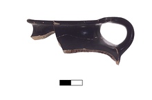Description:   Fragment a (mended from five fragments) makes up half of the rim and neck with part of shoulder and one handle of a small chytra. Three more loose fragments: b) section of the rim, c and d) wall fragments.