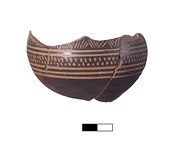 | Description: | Four joining body fragments. Rounded body from a globular pyxis. Good semi-lustrous paint, mostly fired black, with small patches of red/reddish-brown. Lower preserved body painted solid. Mid-point decorated from bottom to top: three thin horizontal bands; zigzag; three thin bands; groups of opposed diagonals, with the interstices painted solid. Interior reserved. Clay fired close to pink 5YR 7/4. Early Geometric. | |