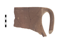 Description:   Rim and handle fragments of a wheelmade large cooking jar. Fragment (a) mended from sixteen pieces and fragment (b) from three pieces.