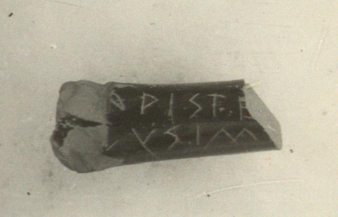 | Description: | Black glaze large cylindrical handle. Small fragment (about 0.007m. in diameter) of glazed inner surface of pot preserved. Along upper (? better glazed) surface, scratched: <graphic> Attic clay. Glaze fairly solid black on inscribed surface, painted thin oposite side; solid red on preserved inner surface. | |