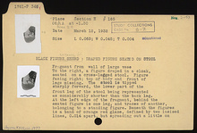 | Description: | Fragment from wall of large vase. To the right, a figure draped in a cloak, seated on a cross-legged stool. Figure facing right; top of body and front of legs missing. The stool is tipped sharply forward, the lower part of the front leg of the stool being represented as considerably shorter than the back leg. At the left edge of the fragment, behind the seated figure is one leg, and traces of another, belonging to a standing figure. Beneath the figures is a band of orange-red glaze, defined by two incised lines, 0.014m. apart, but spreading out a little on either side of them. Clay Attic; fine black glaze inside, turning to red at the bottom of the fragment. Sparing use of incision; white paint for dots on borders of garment, and on chair. Purple stripe on hanging end of garment. | |