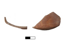 | Description: | Base and lower wall fragment (a) and a wall sherd (b). Carinated bowl. No decoration. Clay brownish, slip washy deep red on outside, purplish on inside. Clean breaks. Probably Knidian ware. Context material mainly first half 1st century (a few later sherds). | |