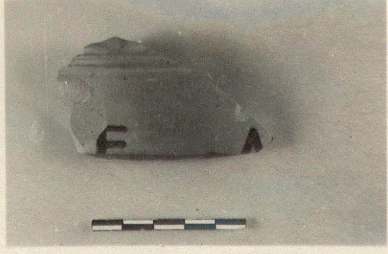 | Description: | Broken on all sides; from a measure similar to P 3559. On the outide, beneath two carefully made grooves, the tops of two letters, painted in black glaze over fine buff slip. Inside, lustrous black glaze. Joined to P 5899 and P 5901. | |