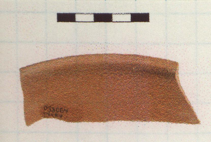 | Description: | Single fragment. Shallow groove on inside below rim; no decoration. Hard-fired; darkish red tint. 'Late Roman C', form 3 early rim. Ca. 400 A.D.? | |