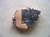| Description: | Body sherd of a Panathenaic amphora. Broken all around. Interior unglazed. Reserved area with painted letters running vertically. Inscription unclear, letters partly chipped: <graphic> Buff clay, some mica. Brownish slip, mat black glaze. Context: 1st c. A.D. | |