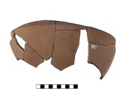 | Description: | Three non-joining sections mended from nineteen fragments, frag. a: whole foot, about one-third of lower body, and a bit of shoulder with lower handle attachment (handle not mended, now frag. d). Frags. b and c: part of lower body and shoulder. Flaring ring foot; underside offset from foot by wide groove. Fine fabric with some sparkling inclusions, including small flecks of silver mica. Exterior mottled, but mostly ca. 7.5YR 6/6 (reddish yellow). Interior darker (ca. 10R 5/4), with patches of residue, perhaps resin. | |