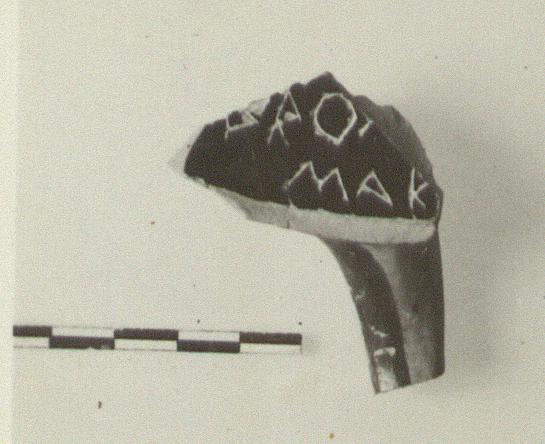 | Description: | Fragment from the wall of a kylix, including part of one handle. Covered with good black glaze inside and out. Scratched through the dry glaze of the inside, the feet of the letters toward the rim, is the graffito of six letters and a trace of a seventh. | |