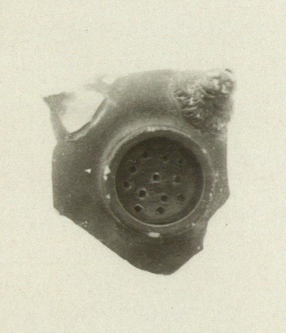 | Description: | Fragment from top of guttus. Ring handle broken away; high edge around perforated top; lion spout. | |