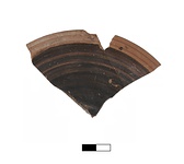 | Description: | About one-fifth of a plate. Mended from two fragments. Low ring foot, floor slightly recessed. Projecting rim with two grooves on top. Orange fabric. Matte thin glaze fired purple to black, rim reserved. | |