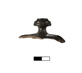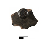 | Description: | Whole knob attached to lid, about half of upper part of lid preserved. No rim. Glaze cracked in places. Molded knob, narrow stem. Orange clay. Mottled black glaze inside and out. | |
