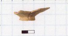 | Description: | Mended from three fragments, about one-fifth of lid including knob. Straight wall, short flat knob. Light powdery buff fabric. | |