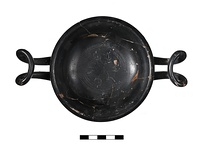 | Description: | Mended from 25 sherds. Complete but for few gaps in the body particularly in handle zone. Moulded foot with scraped groove on exterior and on resting surface both filled with miltos. Underside concave. Molded rim. High swung handles with upwards curving nearly horizontal. Round in section. Interior bottom stamped with six palmettes within six spiral rouletting bands. Buff orangey clay. Good black glaze over all. | |