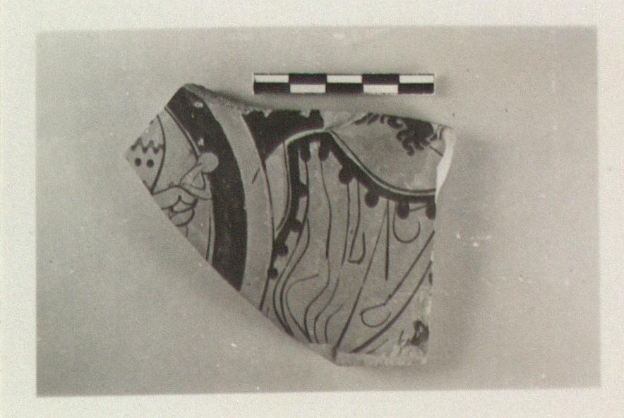 | Description: | From the wall of a large closed vase, unglazed inside. At the left, a left hand holding a shield; at the right, the hair and upper body of a youth wearing a bordered garment. Inversion for the borders of the shield; the outer red border outlined by compass-drawn circles and by relief contours. Relief contours also for the youth's shoulder and the hand. The hair painted in heavy black brush strokes; also the garment border and the decoration inside the shield. All the details, drapery, etc., drawn with thick relief lines. Red wash. The glaze dull. | |