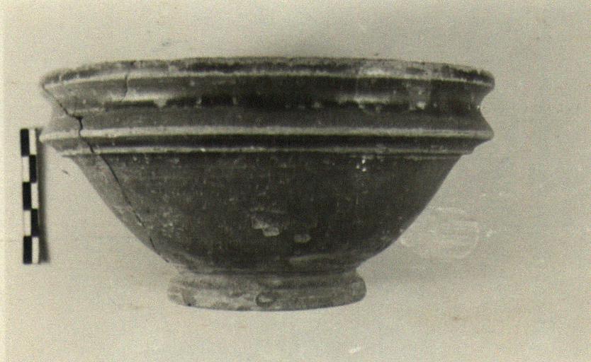 | Description: | Mended from five pieces. Ring foot. Keeled rim, with a corresponding projection at the top, above the concave vertical lip. Pinkish buff clay; red glaze, mottled, and somewhat pitted inside and out. Pergamon Ware. ADDENDA Transitional piece; perhaps should be called early Roman. Stored on shelves with Roman pottery. | |